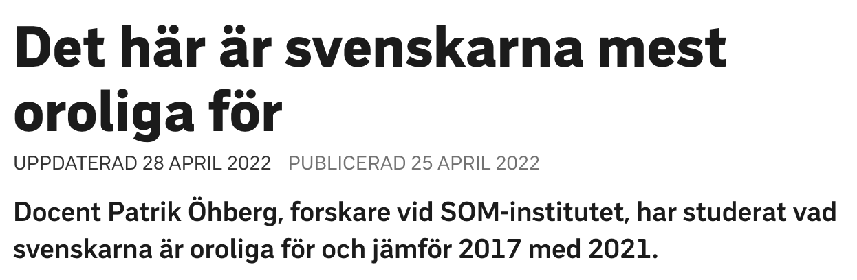 Artikel om vad svenskar oroar sig mest för enligt undersökning